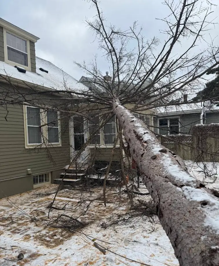 Trees that fall onto structures often shift when cut, which makes controlled removal critical. Proper rigging and sectioning prevent further roof or gutter damage.